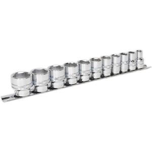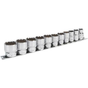 Cold-forged Chrome Vanadium steel 12-point sockets, hardened and tempered for added strength. Fully polished chrome finish for corrosion resistance. WallDrive® configuration giving an additional 30% more torque handling power than traditional sockets. Knurled ring for extra grip with oily fingers. Supplied with socket rail. Features & Benefits: • Cold-forged Chrome Vanadium steel 12-point sockets, hardened and tempered for added strength. • Fully polished chrome finish for corrosion resistance. • WallDrive® configuration giving an additional 30% more torque handling power than traditional sockets. • Knurled ring for extra grip with oily fingers. • Sizes: 12-point; 5/16", 3/8", 7/16", 1/2", 9/16", 5/8", 11/16", 3/4", 13/16", 7/8", 15/16" • Supplied with socket rail. • Lifetime guarantee*. • Model No. AK2673 Specifications: Model No AK2673 Brand: Premier Configuration: 12pt Socket Contents: 5/16", 3/8", 7/16", 1/2", 9/16", 5/8", 11/16", 3/4", 13/16", 7/8", 15/16", Socket Rail Depth: Deep Nett Weight: 1.11kg Qty: 11 Type: 3/8"Sq Drive - Imperial