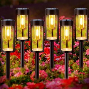 【High-Efficiency Solar Panel】Our solar garden lights are equipped with a larger and more efficient monocrystalline silicon solar panel, which has the highest photoelectric conversion efficiency of all types of solar cells. Built-in 800mAh battery, the solar path lights can work 10-12 hours after fully charged, providing a long working time for your outdoor garden decor. 【Easy To Install & Use】No extra wires or tools are needed, just install these solar lights by staking them into the ground in direct sunlight. The outdoor solar lights feature a sensitive light sensor that automatically turns on at dusk and off at dawn. Please make sure to turn on the switch before first use. 【Hold Up in Bad Weather】IP65 Waterproof. Corrosion-resistant ABS plastic material gave these solar garden lights a long service life and durability. These waterproof solar garden lights work well in bad weather, wind, rain, snow, frost. 【Multipurpose Decoration】Beautiful solar garden lights add a splendid sight to