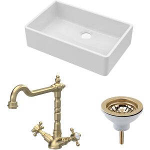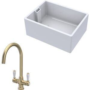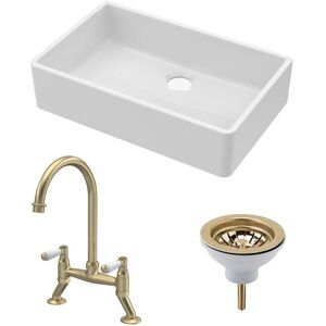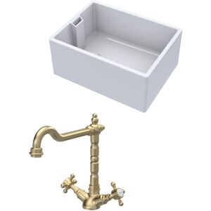 Fireclay Kitchen Bundle - 595mm 1 Bowl Belfast Sink with Strainer Waste & Bridge Mixer Tap, Chrome Upgrade your compact kitchen with this 595mm Belfast sink bundle, featuring a modern chrome bridge mixer tap for sleek style and effortless usability. Spacious single bowl, perfect for compact kitchens with style. Made from premium fireclay, it’s resistant to heat, scratches, and stains. The strainer waste ensures efficient drainage, while the bridge mixer tap delivers precise water flow, perfectly blending traditional Belfast style with contemporary functionality. Product Highlights: Style: Fits perfectly with a range of kitchen styles, blending traditional charm with modern elegance. From cosy, vintage kitchens to sleek, modern spaces, its versatile design brings a touch of class to your kitchen. Fireclay craftsmanship: Sink handmade using traditional methods by Master Potters, offering strength, authenticity, and a crisp white finish that lasts for years. Spacious Single Bowl: Deep,