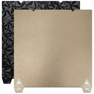 Features: Why choose a double-sided PEI and PEO bed plate? 1. Bend to remove the model After printing, the model can be easily removed by simply bending the spring steel. There is no need to use tools such as scrapers, which reduces unnecessary expenses for accessories. 2. Double-sided textured PEI bed and smooth PEO bed Innovative double-sided PEI spraying technology. Just buy a block of PEI board and get double the usage time. The textured brings excellent adhesion. 3. PEI + Spring Steel + PEOS Selected high-quality PEI and PEO particles, combined with stable and reliable spring steel, you can get a better printing experience than magnetic stickers and glass bed. 4. Compatible materials Both of the double-sided PEI and PEO printing sheet the same excellent performance. Double-sided PEI and PEO bed sheet can fit PLA, TPU, PETG, ABS, WOOD... Specifications: 310 x 315 mm Note: The actual product may have slight color differences, one side is PEI and the other side is PEO Material: