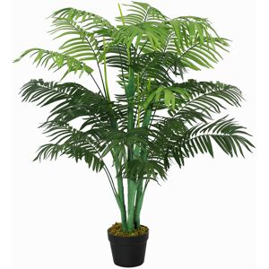 Areca palm tree with UV protection. This tree is designed to go outside. It has a plastic trunk and plastic leaves. As we have it arranged in our photos this measures 125cm x 100cm x 100cm. The branches are wired and so the leaves can be shaped to fit your space. It comes potted in a weighted black plastic pot (measuring 18cm (d) x 14cm (h) approx). These trees look most impressive if you put them inside a decorative planter and cover the top with gravel or soil. Leaf