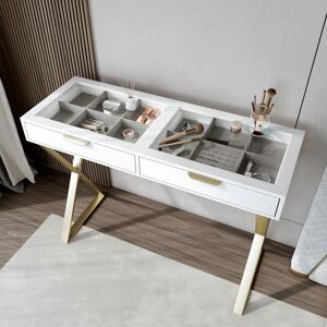 Elevate your space with this modern and chic Jess dressing table, a perfect blend of style and functionality. Featuring a sleek white finish, it includes two spacious drawers lined with soft grey compartments, perfect for organizing cosmetics, jewelry, and accessories. The glass tabletop not only adds sophistication but also offers a clear view of the contents within the drawers, enhancing both practicality and style.Its minimalist silhouette ensures it complements contemporary interiors effortlessly. The standout design includes X-shaped gold metal legs, providing a sturdy foundation and a luxurious modern look. Gold-finished handles complement the legs, creating a cohesive and refined aesthetic. Our mirror Maisie is the perfect match for this dressing table, completing the look with elegance and functionality. The Maisie mirror is sold separately. Ideal for bedrooms, dressing rooms, or vanity spaces, this dressing table transforms your daily routine into a stylish ritual. Canora Grey