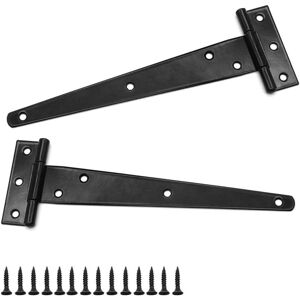 INSTALLATION: T-hinges are not recessed like many other types of door hinges. Wooden gate hinges come with 14 screws for quick and easy installation. DURABLE: T-hinges are a mechanical bearing that connects two solid objects - your door and the door jamb - while providing smooth, friction-free operation of your door or gate. HIGH-QUALITY MATERIALS: Black metal T-hinge made from high-quality iron, with a galvanized process. T-hinges provide additional support to doors, allowing the hinges to be used on a number of light to medium-duty door types. PACKAGE INCLUDES: The package includes 2 pieces of black T-hinges and 14 screws, 200 mm / 8 inches long, the hole is 5 mm / 0.2 inches. WIDE APPLICATION: These T-hinges can be used on domestic garden gates, barn doors, and even shed doors. These metal gate hinges can also be used on a range of different materials.