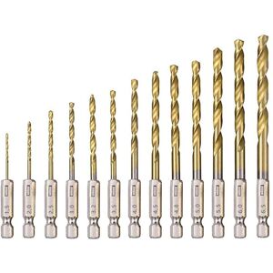 【Professional twist drills】Set of 13 pieces: 1.5 mm (1/16"), 2 mm (5/64"), 2.5 mm (3/32"), 3 mm (7/64"), 3.2 mm (1/8"), 3.5 mm (9/16"). 64" / 162.6 cm cm), 4mm (5/32"), 4.5mm (11/64"), 4.8mm (3/16"), 5mm (13/64"), 5.5mm (7/32"), 6mm (15/64"), 6.5mm (15/64") /10.2 cm High Quality Material: The drill bits are made of high speed steel with a coating of titanium, which is super heat resistance and long service life. Quick Drill Bit Replacement: The 1/4" hex handle is suitable for all power tools, which is easier/more convenient/safe to use. It is suitable for power tools screwdriver, drill, etc. or standard drill chuck. Smooth Drilling: Designed as a 135° cutting angle, which can automatically center and quickly penetrate with a little pressure. Thread grooves can Remove chips and dirt better and quickly.