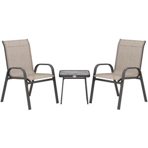This Outsunny three-piece set is great for relaxing with company outdoors. Comes with two chairs and table. Each piece has a steel frame: strong and supportive. A great addition for all outdoor spaces.Features:Three-piece set: two chairs and table. Ideal as balcony furnitureSteel frame for a strong coreChairs stack to save spaceHigh back and armrests for supportAssembly required