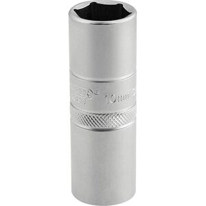 Expert Quality, 6 point deep socket with a rubber insert for plug protection and retention. Manufactured from chrome vanadium steel hardened and tempered with a micro satin finish. Socket length 65mm. Each socket has a knurled ring for extra grip. Features and Benefits • Expert Quality • Rubber insert for plug/retention • Chrome vanadium steel hardened, tempered and micro satin chrome plated • Length 65mm Contents 1 x 12mm Thread 6 Point Satin Chrome Spark Plug Socket, 1/2" Sq. Dr., 18mm