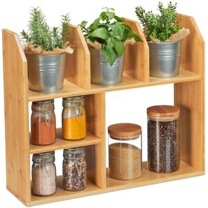 This cute standing shelf can be used universally in any living area. In the kitchen, tea tins, spices and storage containers can be stored on the shelf within easy reach. In the living room, the standing shelf cuts a fine figure when filled with books and decorations. But the shelf can also be used as a bathroom shelf for cosmetics and much more. Made of natural bamboo, it fits in well everywhere and is also moisture-resistant. Assembly is quick and easy thanks to the instructions. Bamboo shelf in detail - Dimensions H x W x D: approx. 45.5 x 55 x 16 cm - Weight: approx. 3.2 kg - Material: bamboo - Colour: natural Storage shelf with 6 compartments - 1 large compartment H x W: approx. 27 x 30 cm, load capacity: approx. 10 kg - 2 medium compartments H x W: approx. 13 x 21 cm, load capacity: approx. 5 kg each - 4 small compartments H x W x D: approx. 16 x 16.5 cm, max. load: approx. 3 kg each Narrow table shelf - For standing on - Floor buffers protect the base - As a kitchen shelf for