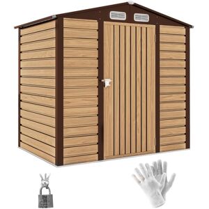 Bring handy storage to your outdoor spaces with this Outsunny garden shed. The 4 x 6ft size is completely open inside - a great shelter for all your gardening tools and equipment. Made from galvanised steel for a strong structure, fitted a large door to allow easy access. Complete with a latch and lock to keep the door securely shut. OUTSUNNY 6.2 x 4.3ft Garden Metal Shed with Vent for Garden, Patio, Oak in Brown Size: 1 Pack