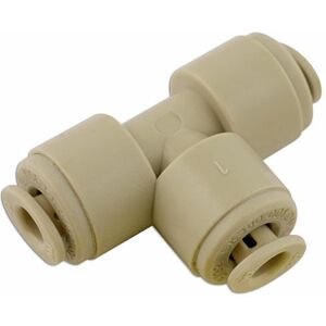 Push-fit couplings are an economical, quick and easy way to way create your own workshop ring main air supply, plus pipe work for water, beverages & inert gas supplies. Plastic push-fits are a light weight solution and will not corrode. Unique collet design for quick and easy connection and disconnection. Ideal for the professional workshop. PSI Range Temp range 1C - 64C = 230PSI. PSI Range Temp range 65C + = 150PSI. Push-Fit Tee Piece ISO 9001 : 2008 ANSI/NSF - 61 5/16in. Equal Union 10pc