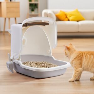 Description This cat litter box features a unique dome-shaped design with adorable cat-ear details, combining aesthetics with functionality. Its spacious interior offers a comfortable bathroom space for your cat, while the fully enclosed structure effectively prevents litter scatter and traps odours to keep your home fresh. The dual-door design allows easy access for your pet, and the 90° flip-top lid with an included scooper makes cleaning effortless—a perfect choice for cat owners! Features *Made of high-quality PP and ABS plastic for long-lasting use. *Rounded edges ensure safety and comfort for your cat. *Easily transforms into an open-style litter box by removing the top cover. *Detachable design allows for quick and thorough cleaning to maintain hygiene. Specifications Overall Dimensions: 47.9 cm W x 66.8 cm D x 49.5 cm H Material: PP + ABS Colour: Grey + White Product Type: Cat Litter Box Enclosed: Yes Odour Control: Yes Pet Door Included: Yes Scoop Included: Yes Detachable: