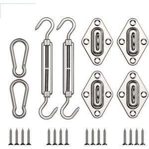 SUPERIOR STAINLESS STEEL: The entire hardware kit is made of high-quality, heavy-duty 304 marine-grade stainless steel. They have good rust resistance and can withstand the effects of UV, rain, wind, and other natural weather. Excellent material makes the kit durable, strong, and safe. VALUE PACK: This shade sail hardware kit comes with 2 turnbuckles (adjustable from 5.67 to 8.11 inches), 2 carabiners, 4 grommets, 16 screws, creating a high load-bearing capacity and ensuring optimal tension for your awning. EASY INSTALLATION: Suitable for solid structures such as drywall, concrete, brick, wood, and cement walls, and fits any type of triangular shade sail to easily install your favorite relaxation spot. WIDE APPLICATION: Designed specifically for outdoor use, suitable for garden, patio, backyard, gazebo, deck, cafe, or applied to landscape chandelier lighting. Delivered Quantity: 1 set of 24 pieces
