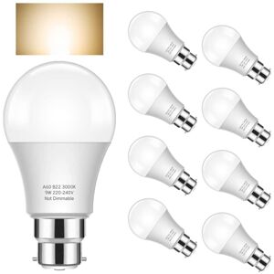 Super Bright: These bayonet bulbs turn on instantly and provide a super bright uniform light of 900lm, 6000 Kelvin daylight white light for a comfortable and relaxing atmosphere Energy Efficient : These 9W bayonet bulbs are as bright as 60W halogen bulbs and save up to 90% on your electricity bill. CE and RoHS Compliant, Safe for Your Home and Environment Long Lifespan : With a lifespan of up to 15,000 hours, B22 LED bulbs can be used for more than 13 years (calculated as 3 hours per day), durable and low consumption. No need to change bulbs frequently Easy to Install : Standard B22 bayonet base, just screw into the light socket, which can be replaced easily. Instant light at 100%, no warm-up time required No flickering : The bulb B22 bayonet adopts the latest LED technology, bids farewell to the problem of flickering, and keeps you away from visual damage, eye fatigue and annoying noise Color rendering index> 80+ Instant power on, no warm-up time required Beam angle 270° Wide range