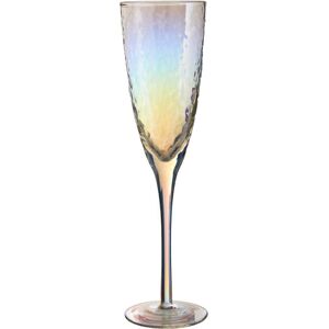 The Aurora champagne glasses have a hammered effect finish that texture their bowls with round indents. Their iridescent lustre rewards the eye with shades of blue, violet, red and gold, reminiscent of the dramatic borealis that lights up the northern skies on special occasions. Their elongated stems are smooth and clear, and taper down to round bases.