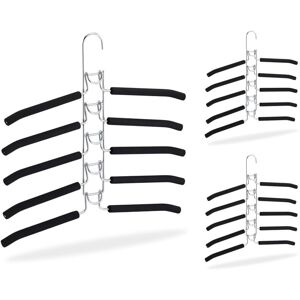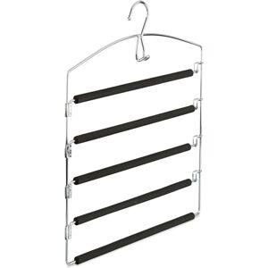 This clothes hanger with multiple rails made of chromed iron is a reliable assistant when it comes to storing your clothes. The hanger features 4 rails that can be swivelled individually. This way, you do not have to remove the entire hanger from your closet. The rails are covered in black foam to assure that your clothes do not slip - Handy! Space-Saving Trouser Holder Details - Total size: H x W x D: approx. 44.5 x 37 x 2.5 cm - Length of rails: approx. 34.5 cm - Distance between rails: approx. 6 cm - Material: Chrome-plated iron, EVA foam - Weight: approx. 360 g - Colour: Black, silver Multiple Pants Hanger - Swivel rails - For storing pants and skirts - Rails individually usable - Black foam padding - With sturdy metal hook Included in Delivery - 1 x or 3 x Coat Hanger - Decorative items shown in product photos are not included