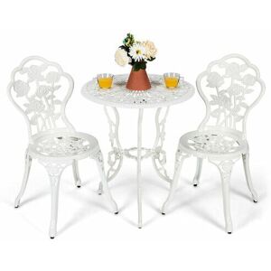 Enjoy outdoor leisure time with our beautiful yet practical 3pc bistro table set. Bistro sets are perfect for any small space or to accent a larger space. And it offers you a quiet, cozy space outdoors to host a conversations, read a book, enjoy morning coffee or whatever else you like. Lightweight and constructed of rust-free cast aluminum, which ensure it can lastthroughout the seasons. The highlight of this bistro table set is antique exquisite appearance. This bistro set is best decor to your garden and give your guest a deep impress. Its also versatile, simply add some throw pillows to add color and pattern, or you can mix and match this outdoor patio furniture with other pieces from the collection.Garden round top table equipped with a umbrella hole, this can be used with umbrella for sin-shade and rain-protection. Then you can enjoy your leisure time whether it's sunny and rainy. So, buy it now, it would never let you down.