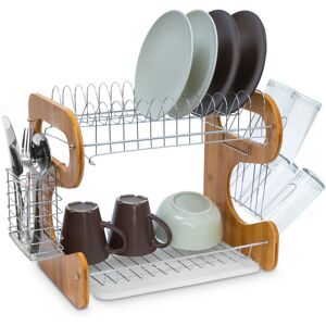 Make life a little easier by air-drying your dishes on this drying rack! Place your freshly-washed plates, cups, cutlery, bowls and cutting boards on the drainer and allow the water to run off into the drip tray so no water accumulates on your countertop. The dish rack is made of metal and bamboo, which is especially suitable for moist environments. Details on the 2-Shelf Bamboo Draining Rack • Size: approx. 35 x 51 x 26.5 cm (13.8 x 20.1 x 10.4 in) • Length with cutlery basket & holder: approx. 51 cm (20.1 in) • Weight: approx. 1.8 kg (4 lbs) • Material: Bamboo and chromed metal Dish Drainer for Plates, Glasses and Bowls • Let your dishes dry on their own • Place plates upright between the bars • No more puddles with the drip tray • Robust and moisture-resistant bamboo material • With cutlery basket and glasses/cutting board holder Included in Delivery • Bamboo and metal draining rack • Cutlery basket, drip tray, glasses holder • Decorative items shown in product pictures are not