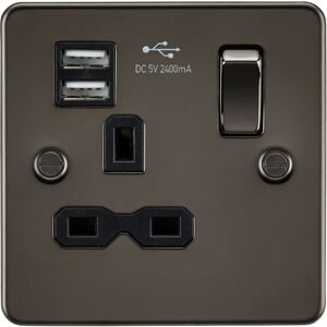 Specification Flat plate 13A 1G Switched Socket with dual USB charger (2.4A) - Gunmetal with Black Insert 230V IP20 Finish: Gunmetal Material: Premium grade steel Height: 8.75cm Width: 8.75cm Projection: 0.25cm Wattage (max): 2.5-3.5 (dependent on wiring conditions)W Description This charger socket is a great finishing touch to any modern home. Flat Plate low profile metal design with matching metal rocker. Built in Dual USB Charger - 13A Switched socket - Dual USB Charging 5V DC2.1A (shared) - Ultra low profile design with built in gasket - Certified to BS1363-2 - EMC Certified and ErP Ready - Minimum mounting box depth 25-35mm* *dependent on wiring conditions WE RECOMMEND YOU ALWAYS USE CERTIFIED USB CABLES FOR SAFETY AND TO ENSURE COMPATIBILITY