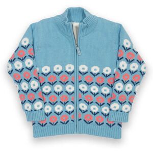 Outer: 100% organic cotton Lining: 100% polyester Hygge knit design Iceberg blue 5-gauge chunky plain knit Zip through with iceberg blue herringbone tape zipper pull Long sleeved Iceberg blue ribbed cuffs and hem Fully fleece lined Stand up rib collar Made in India Machine washable at 40 degrees, or at 30 degrees to be kinder to the planet