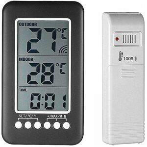 Display indoor/outdoor temperature and time at the same time.Record max indoor and outdoor max temperature. Adopt wireless technology, you can know outdoor temperature in indoor receiver. With the handheld transmitter to sensor outdoor temperature and transmit within 100m unobstructed. 12H/24H format, temperature unit ℃/unit for selection. Can be placed on the table or hung on the wall. Product Description This LCD digital temperature clock which can display simultaneously indoor and outdoor temperature and time, is ideal for home use. It is suitable for layout or wall hanging. Large LCD display, you can easily read the value. Accurate measurement for measuring indoor and outdoor temperature. FeaturesMaterial: ABS The color: black Display: 94*54mm LCD screen Indoor temperature measurement range: 0~50℃/32~122℉ Outdoor temperature range: -20~70℃ / -4~158℉ Temperature Accuracy: ±1℃ Indoor temperature detection period: test once 30 seconds Outdoor temperature detection period: test once