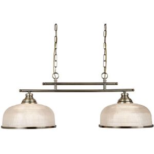 This Searchlight Bistro II two light bar ceiling light is finished in antique brass and comes complete with glass shades.ᅠ This stunning light is suspended on chains and the ribbed acid glass shades make this a striking light.ᅠ It would look equally incredible in a cafe or bar, or indeedᅠ over a kitchen worktop or island. Product code: 3592-2AB FEATURES: * Finished in antique brass * Matching items available and also finished in satin silver (please see website) * LED * Class 1 earthed SIZE: * Drop - 800mm * Height - 270mm * Width - 270mm * Length - 750mm BULBS: Takes 3x 7 watt E27 LED Bulbs - Not included.