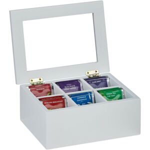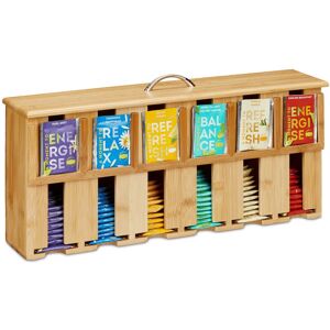 The tea bag box made of bamboo is ideal if you want to store different types of tea in a neat and aroma-protected way. The 6 compartments each hold 12 tea bags of your favourite varieties and are always ready to hand. The tea container prevents annoying searching in the storage cupboard and is a discreet eye-catcher on the kitchen shelf or worktop. The sturdy tea box with practical lid ensures dust-protected storage. Tea container in detail - Overall dimensions H x W x D: approx. 9 x 21,5 x 16 cm - Inner dimensions per compartment H x W x D: approx. 7,5 x 6 x 6,5 cm - Weight: approx. 0.7 kg - Material: Bamboo, Acrylic - Colour: Black Practical tea bag organiser for home - 6 compartments to store different kinds of tea clearly arranged - Approx. 12 tea bags per compartment - avoid chaos in drawers - Also perfect for baking ingredients, coffee pods & co. - Transparent front makes it easy to see what's inside - Tea chest with airtight lid - dust-protected storage Included in delivery