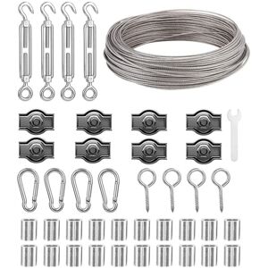 Comprehensive kit includes a 30m long, 2mm thick stainless steel wire rope, four turnbuckle rope tensioners, eight wire rope clamps, four snap hooks, four wire rope thimbles, twenty aluminium crimp loop sleeves, and one open-end spanner. perfect for a variety of uses including as a tent rope, clothesline, trellis for climbing plants, garden fence, outdoor chandelier, and porch railing. Constructed from high-quality stainless steel, this wire rope cable is designed for durability and long-term use. Boasting a nylon-coated , it offers excellent corrosion and rust resistance even in harsh weather conditions while ensuring waterproof toughness. Installation is a breeze. Easily cut the wire to the desired length with wire cutters and use crimping tools to tighten the aluminium crimp sleeve. With hook and turnbuckle wire tensioning system, it is corrosion-resistant, offering a lockable and reusable solution, making maintenance and adjustments hassle-free. Our wire rope kit's versatility
