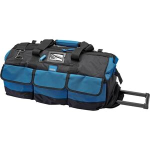 Manufactured from water repellent polyester with PVC backing on wheels with foldaway handle which retracts into base. Rope reinforced handles, nylon zip with framed opening and reinforced base with rubber grip squares. Many different - sized internal and external pockets for storing tools and accessories. Supplied with detachable shoulder strap. Features and Benefits • Water repellent polyester with PVC backing on wheels with foldaway handle which retracts into base • Rope reinforced handles, nylon zip with framed opening and reinforced base with rubber grip squares • Many different-sized internal and external pockets for storing tools and accessories • Supplied with detachable shoulder strap • Overall size: 600 x 300 x 350mm Contents Overall size: W 600 x D 300 x H 350mm Weight: 2.97kg