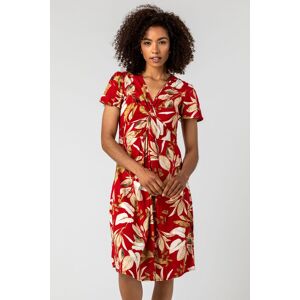 Leaf Print Twist Knot Dress by Roman UK Give your seasonal collection a new flair Romans latest addition is a fit and flare skater dress with a vneck and short sleeves This classic red dress is elevated with a figureflattering twist knot front and eyecatching gold leaf details Ideal for sunny days we think this dress will look great with a denim jacket and sandals or worn with a chic coverup on warmer days Womens Regular fit True to size 100 Viscose Machine Washable VNeckline 100 Viscose