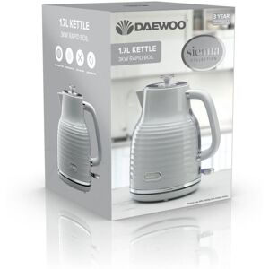 Elevate your kitchen with the Daewoo Grey Sienna 1.7L Jug Kettle, a harmonious blend of timeless design and modern functionality. Boasting a traditional lift-off lid and a textured body, this kettle exudes elegance while offering seamless 360° rotation on its cordless base, catering to both left and right-handed users. The 3kw powerful element ensures swift boiling, while the 1.7 litre capacity, clear water fill indicator, and power-on LED indicator enhance convenience and offers up to 7 cups from each fill. The removable limescale filter, automatic shut-off and boil dry protection ensures safety, whilst also extending the life of your kettle! The Sienna range features a corrugated texture design in a glossy finish Concealed element to prevent limescale build-up Auto-shut off & 1.7L capacity Removable filter & 360 swivel base 3KW power output for rapid boil Matching toaster available Dimensions: ‎22L x 17.5W x 24.5H cm