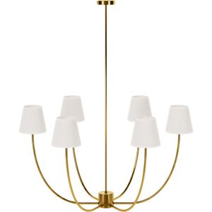 Add a touch of elegance and sophistication to your space with this spectacular chandelier-style pendant lamp. Made of metal with an aged gold finish, this designer piece features six fabric shades in a soft cream color that distribute warm and cozy lighting. Ideal for hotels, restaurants, or as the centerpiece over the dining table, this lamp not only illuminates but also transforms any environment into a chic and refined space. Let yourself be seduced by the charm and classic style of this chandelier and enhance your decor with a touch of timeless luxury. Dimensions : 76 cm x 76 cm x 130 cm (L x W x H)