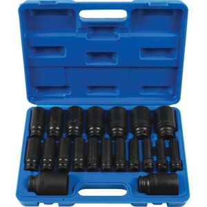 A comprehensive 1/2""D standard and deep single hex (6pt) socket set, from 10mm - 32mm, made from polished chrome vanadium. 17 x 1/2""D standard sockets: 10, 11, 12, 13, 14, 15, 16, 17, 18, 19, 20, 21, 22, 24, 27, 30 and 32mm, all 40mm long. 8 x 1/2""D deep sockets: 10, 11, 12, 13, 14, 15, 17 and 19mm, all 76mm long. 2 x 1/2""D spark plug sockets: 10, 14mm; both are 65mm long. Accessories: 1/2""D 24 teeth ratchet, 2 x extension bars (125mm and 250mm long), universal joint, 3/8""D (F) to 1/2""D (M) adaptor.