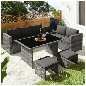 The 5 piece patio rattan corner sofa furniture set is modern and stylish, offering users not only versatility but also a unique user-friendly design, giving them comfort and a superior outdoor experience. The table features a tempered glass top with 69cm height provide ample serving space for dinner and is easy to clean up. Soft padded cushioned seats will let you and your guests to sit back. Let brings you a happy leisure time. Relax and enjoy the great outdoors. Features: 【Compact Design】 This 7-seat Rattan Dining Room Sofa consists of a 5-seat L-shaped sofa with storage box, a dining table and 2 stools. 【Wonderfully Versatile】 The corner storage features with hinges can be used as a table and storage box, great for quickly and conveniently storing away any mess in a hurry. Ultra-deep capacity design for easy storage of sundries. Two extra stools can be stored under the dining table for a compact design. 【High-Quality Material】 Constructed with a PE rattan weave material, UV