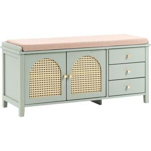 Boho Accent Shoe Bench with Storage Space. The ideal combination of comfort and design for your entryway or living room. This elegant cabinet combines a sturdy MDF body in a subdued colour with natural rattan cane webbing on the fronts. A soft, padded cushion sits on top, providing a comfortable seating area. The unit offers versatile organisation with door compartments for footwear and three drawers for accessories, making it a practical and trendy addition in a boho style. Details: Product Type: Shoe Storage Cabinet Style: Boho General Color: Green Shade: Mint Green Material Type: Wood Main Material: MDF Additional Material: PE Rattan Frame Material: Engineered Wood Legs material: Engineered Wood Top Material: Engineered Wood Material Composition: 100% Polyester Finish: Painted Leg Caps/ Pads: Yes Capacity: Up to 8 Pairs of Shoes Dimensions: Depth: 34 cm Width: 100 cm Height: 47 cm Weight: 21 kg Top Weight Capacity: 100 kg Offer Includes: 1 x Shoe Storage Cabinet Key Features: