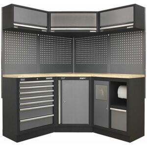 Standard features include: Modular design to enable easy upgrading. Tough and durable construction with a hammered metal finish on the doors and drawers. Aluminium handles and drawer pulls. Ball-bearing slides throughout. Choice of worktop - pressed wood or stainless steel. Gas struts on wall cabinet doors or simple tambour front. Floor cabinets feature adjustable shelves. Each unit supplied with a lock and two keys (except wall cabinets). Tough and durable construction with a hammered metal finish. Aluminium handles and drawer pulls. Drawers fitted with ball-bearing drawer slides. 36mm pressed wood worktop. This item is heavy. Extra assistance must be provided at the delivery point to help safe delivery. Package includes: APMS62 - Modular Cabinet 7 Drawer 680mm APMS53 - Modular Wall Cabinet 680mm (x2) APMS57 - Modular Multifunction Cabinet 680mm APMS60 - Modular Corner Floor Cabinet 865mm APMS61 - Modular Corner Wall Cabinet 865mm APMS50BP - Modular Back Panel 615mm (x2) APMS60BP