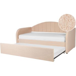 Upholstered Daybed with a Trundle. This multifunctional bed is the perfect piece of furniture for a children's or guest room. The bouclé upholstery in a light beige colour and the trendy design make it a timeless décor piece. Thanks to the backrest, the bed can be used as a sofa and by pulling out the lower part, you can easily get an extra sleeping surface. The durable frame, slatted bases and stable construction guarantee quality for a long time. Details: Product Type: Daybed Style: Modern General Color: Beige Shade: Light Beige Material Type: Fabric Main Material: Boucle Additional Material: Eucalyptus Wood Material Composition: 100% Polyester Fabric Upholstered Back: No Storage: No Dimensions: Headrest Dimensions: 99x72 Width: 99/191 cm Length: 217 cm Height: 102 cm Sleeping Surface: 90x200 cm Weight: 59 kg Weight Capacity: 160 kg Offer Includes: 1 x Bed Frame, 2 x Slatted Frame (12 Sprung Slats), Not Included: Mattress, Bedding and Cushions Key Features: Second Hidden Bed to Use