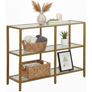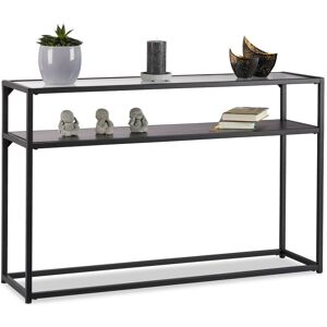 Whether you use this console table for your keys and telephone in the entrance hall or you place photos and flowers on it in the living room is your choice! Thanks to the adjustable feet, any unevenness in the ground can be easily leveled out. But the narrow hall table also looks good. With the transparent tabletop made of glass, the black metal console table is given a touch of elegance that immediately adds that extra touch to your living room. Console table at a glance - Total dimensions: approx.110 x 35 x 75 cm (LxWxH) - Distance to ground: approx. 74 cm - Load capacity: approx. 60 kg - Weight: approx. 12.9 kg - Material: metal, hardened glass - Colour: black, transparent Modern storage table for the hallway - For entrance areas, bedrooms or living rooms- Surface space for keys, telephone and more- Glass tabletop gives a touch of elegance to the black design- Narrow design - Lots of storage space on a small frame- Adjustable feet to compensate for uneven floors Included in