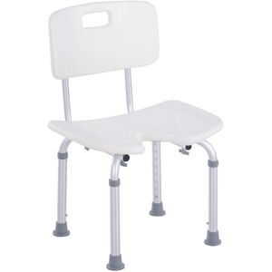 Made for assistance in the shower or bath, this chair from HOMCOM is perfect for the elderly or those who require extra assistance whilst showering or bathing. Made from aluminium, the four legs are resilient to water damage, keeping the chair stable and durable and supporting up to 136kg in weight. Adjustable to eight different heights, this chair helps you find the most comfortable and safe position to sit, with the 'U' shaped plastic seat giving a solid surface to sit. Drainage holes all over the seat prevent water build-up. It's finished with handles to carry easily and non-slip foot pads to keep safely in position. HOMCOM Adjustable Aluminum Bath Stool Spa Shower Chair in White