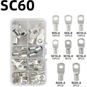 The tinned copper terminal set is safe and reliable, suitable for solar energy systems, household appliances, automobiles, electrical industry, mechanical equipment, distribution boxes, batteries, inverters, etc. The ring terminals are made of high-quality tinned copper materials, which are environmentally friendly and safe to use, and the high-quality electrolytic copper terminals have a long service life. The flared opening of the cable connector terminal makes it easier to insert wires, and it is easier to crimp and solder than the standard closed sleeve type. The copper cable terminal with a sturdy structure improves high-temperature durability, the closed design seals out moisture, and the horn-shaped opening is convenient for wire insertion to ensure the reliability of the connection. The wire terminal connector includes: SC25-8 5pcs.SC25-6 5pcs.SC16-8 5pcs.SC16-6 5pcs.SC10-8 10pcs.SC10-6 10pcs.SC6-8 10pcs.SC6-6 10pcs