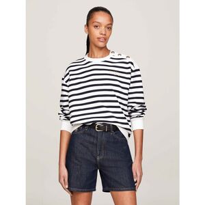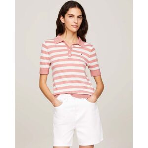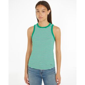 Tommy Hilfiger Stripe Rib Womens Slim Tank Top in Mini Stripe Desert Sky/WhiteBring a flattering style to your casual wardrobe with this slim-fitting tank top, complete with a classic horizontal stripe design. Highlights • Stretch FSC viscose • Ribbed texture • All-over horizontal stripe • Crew neck • Signature detailing on nape • Tommy Hilfiger branding • Tommy Hilfiger flag embroidery on hem Shape & fit • Slim fit Composition & care • 95% FSC viscose, 5% elastane WW0WW41994