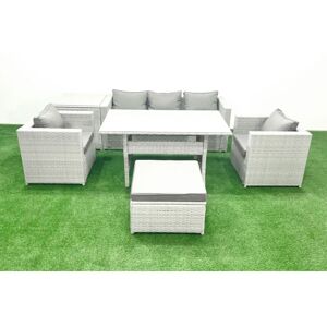 Set Dimensions: 2 x Three Seater Sofa : 177W x 65D x 66H cm; 1 x Fire Pit Table 140L x 80W x 69H cm; 1 x Big Foot Stool: 65L x 65w x 34H cm; Light grey mixed rattan with dark grey fabric .Color may some difference due to light or monitor .we are unable to return the item due to color problem. the product is delivered on pallet, to kerbside only Fimous Garden Dining Sets Outdoor Rattan Furniture Gas Fire Pit Dining Table Gas Heater with Big Footstool in Light Grey