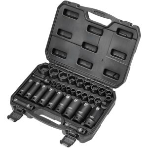 Description High-quality impact sockets forged from chrome molybdenum steel for durability and strength. Hardened, tempered, and chemically blacked for corrosion resistance. Includes a variety of sizes for different applications, such as 9 to 17mm and 13 to 30mm in both standard and deep sockets. Features a hole for accessory spring-loaded ball to secure sockets during use. Supplied in a sturdy plastic storage case for organization and portability. Technical Specifications Material: Chrome molybdenum steel Finish: Blackened for corrosion protection Socket sizes: 9, 10, 11, 12, 14, 15, 16, 17mm, and 13, 15, 17, 18, 19, 21, 22, 24, 27, 30mm Extension bars: 75mm length for both 1/2 and 3/8 drives Adaptor: 1/2 (F) x 3/8 (M) Compatibility and Accessories Designed for use with impact wrenches and power tools that accept impact sockets. Only impact sockets and accessories should be used with air or electric impact wrenches to prevent shattering and injury. Includes extension bars and an