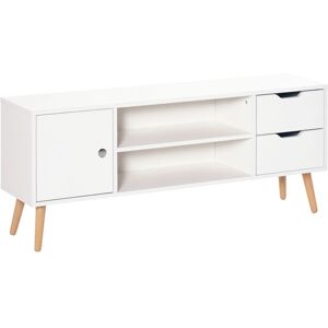 "Create a stylish and modern centrepiece in your living room, which your TV will stand proud on, thanks to this Scandinavian-style tv unit from HOMCOM. Made from durable particle board, it can effortlessly hold up 30kg of weight. It features two open compartments, drawers and a cabinet, giving you plenty of storage room, with a cable hole to manage your wires and make your home tidy. The perfect partner to your entertainment and relaxation times, watching your favourite show or film. Specifications: • Color: White • Material: Particle board, Pine Wood Legs • Overall Dimension: 120L x 28W x 44Hcm • Shelf Inside Cabinet: 55L x 26.5W x 14H cm • Drawer Inner Size: 25L x 18D x 10.5H cm • Weight Capacity: 30kg (overall), 5kg (shelf), 5kg(drawer) • Item Label: 833-968 Features: • 120cm large top surface for your flat TV screen and other decorations. Suitable for TVs up to 50'' • Comes with two open shelves, cabinet and two drawers for handy storage • Cable hole to keep wires together and