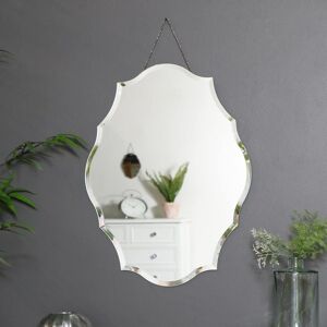 This Ornate Frameless Bevelled Wall Mirror would make a striking wall decor choice for fans of art deco design and frameless mirrors. Made of glass this mirror has a frameless curved corner look design. This mirror has the option of being wall mounted via two hooks on the top back of the item. An stunning art deco style mirror perfect for lovers of vintage style and decorative mirrors. This mirror would look fabulous placed above a dressing table bathroom sink or above a fireplace. This art deco mirror could blend seamlessly into vintage or modern style spaces due to it's simple yet gorgeous design. Part of a large collection of Mirrors available in a wide selection of styles sizes and colours. Want to see more items like this? Browse our Mirrors category for more options. Colour: Clear Silver Material(s): Glass Metal 38cm x 50cm x 0.5cm (width x height x depth) Measurements (other): Height Including Chain 54cm Fully assembled Can be wall mounted vertical