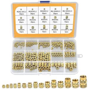 【Premium Material】: These female thread insert nuts are made of excellent brass material, which is not easy to break and durable for a long time, has high hardness, corrosion resistance, durability and stability.【Easy to Use】: The insert nuts are threaded inserts for further insertion into 3D printer parts. Using ultrasound or a soldering iron, slotted nuts can be easily embedded into plastic parts. 【Practical Design】: Spiral knurled nuts have superior strength, which ensures balanced high tightening and loosening torque and strong extraction force, and are not easily deformed due to their shape and teeth. 【Wide Applications】: Threaded insert nuts are suitable for injection molding, PCB assembly, electronics and fastening most plastics, such as plastic, PLA, PETG, ABS, PPS, PP, etc. 【Package Contents】: You will receive 220 pieces embedded nuts in size M2/M2.5/M3/M4/M5/M6 in total, enough for your daily use. Threaded insert nuts are commonly used in injection molding for firm fastening.