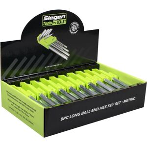 Siegen: Ball-end Hex Key Set9 Piece Exta Long Metic Manufactured from heat treated and hardened Chrome Vanadium steel with a blackened finish. Keys range in length from 90mm to 230mm and in size from 1.5mm to 10mm. Ball-end allows key to drive fixing at up to 30. Supplied in easy-access case with hanging tag for safe storage and quick key selection. MPN: S01094 EAN: 5054511027402 Ball-end Hex Key Set9 Piece Exta Long Metic Attributes: MFR Part No.: S01094