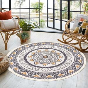 Material: High-quality cotton and polyester, with fringes on each side; Diameter: 120 cm (including fringes). Tip: Since this type of mat does not have a non-slip base fabric, the non-slip effect is very poor, we recommend placing a non-slip mat under the mat. Pattern Printing Design: Cotton rugs designed with printed patterns and extra elegant knotted fringe tassels on each side that make them simple. It will never go out of style. Easy Care: Cotton fabric rugs are machine washable in a mesh bag, colors separately / hand wash / spot cleaning. Do not use bleach. Vacuum regularly for minimal effort, maximum beauty! Good quality: The tightly woven rugs are durable, with excellent water absorption, protecting the floor from stains, moisture, and wear. Place of application: Suitable for living room, bedroom, kitchen, bathroom, entrance, etc.