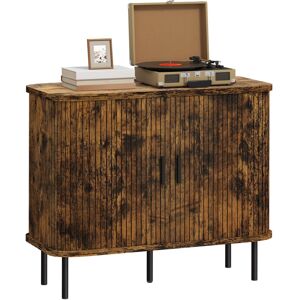 Feature: Mid-Century modern style with slatted tambour doors adds a unique, decorative touch Sliding doors save space in tight areas and provide easy access Two compartments offer large storage behind the doors Four legs with protective foot pads and extra middle legs with adjustable foot pads● Anti-tipping design enhances safety in daily use Melamine coated surface is easy to clean and maintain Can be used as a kitchen cabinet, hallway cabinet, living room cabinet and more Assembly required Specification: Colour: Oak Tone, Black Materials: MDF, Particle Board, Steel Overall Dimension: 90W x 40D x 75Hcm Each Compartment Size: 35W x 33D x 27.5Hcm Bottom Height to Floor: 16cm Weight Capacity: 150kg (total), 30kg (compartment/top) Item Label: 83B-038V80AK 1 x Sideboard 1 x Manual