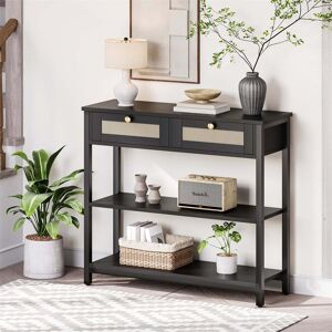 This Large Black 2 Drawer Console Table is a stylish vintage inspired piece of storage furniture ideal for fans of antique style and black furniture. Crafted from wood and metal this console table comes with two storage drawers and a storage shelf. It comes complete with a black painted finish and antique style brass handles. Perfect for placing in a hallway office living room or dining room space. Due to its dark finish and antique look this console table is best suited for those with vintage rustic or farmhouse style spaces. This console tables drawers come with runners for soft and easy opening and closure. This console table is also available in Ivory. This console requires some assembly as the legs need attaching. Part of a large collection of console tables available in a wide variety of colours styles and designs. Would you like to see similar items? Browse our furniture category for more options. Colour: Black Brass Material(s): Wood Metal 110cm x 76cm x 30cm (width x height x depth) Mostly assembled Assembly Time: 10 minutes