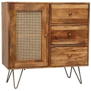 Introducing our exquisite Mango Wood Rattan Sideboard, a stunning addition to elevate your home decor. Crafted with precision and attention to detail, this sideboard seamlessly combines natural materials with modern design elements, offering both functionality and style. With its spacious storage and elegant features, it's the perfect piece to enhance your living room, dining area, or hallway. Features: Made from high-quality mango wood and rattan, showcasing the beauty of natural materials. One stylishly designed door and three drawers provide ample storage space for organizing your essentials. The sideboard stands on brass finish hairpin legs, offering stability and a contemporary flair. Brass finish knob handles add a touch of sophistication and ease of use. Made from legally sourced wood Assembly required: Yes Is Fragile: Yes Dimensions & Weight: Dimension: L40 x W90 x H87 cm Weight: 29.37 kg . Nyack Small 3 Drawer Sideboard . Delivery is free to UK Mainland excluding the