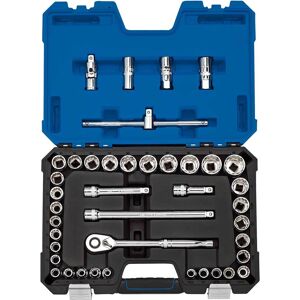 Expert Quality, twelve point socket made from chrome vanadium steel that's hardened and tempered with a polished finish. Each socket has a knurled ring for extra grip. Supplied with a 72 tooth reversible ratchet and accessories. Packed in a tough plastic storage case with soft grip handle. Manufactured and tested generally in accordance with DIN3122 and ISO3315 Specifications Features and Benefits • Expert Quality • 22 metric sockets • 10 imperial sockets • 3 spark plug sockets • 72 tooth ratchet • 3 extension bars size • Sliding 'T' bar • Universal joint Contents 22 x Metric socket: 8, 9, 10, 11, 12, 13, 14, 15, 16, 17, 18, 19, 20, 21, 22, 24, 25, 26, 27, 28, 30, 32mm 10 x Imperial socket: 7/16, 1/2, 9/16, 5/8, 11/16, 3/4, 13/16, 7/8, 15/16, 1" 3 x Spark plug socket: 10, 12, 14mm 1 x 72 tooth ratchet with "quick release" button 3 x Wobble extension bars: 75, 125, 250mm 1 x Sliding 'T' bar 1 x Universal joint
